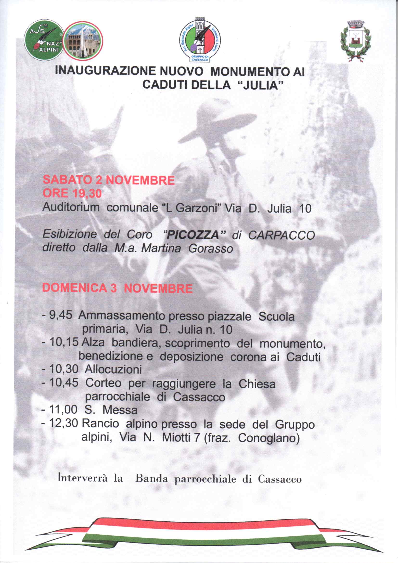 In occasione dell'80° di fondazione il Gruppo alpini di Cassacco organizza il concerto "Canti di Leggi tutto...