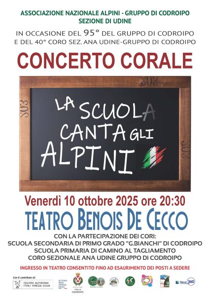 In occasione del 95° di fondazione del Gruppo alpini di Codroipo e del 40° del Coro sezionale Ana Udine-Gruppo di Codroipo si terrà il concerto corale “La scuola canta gli alpini”.