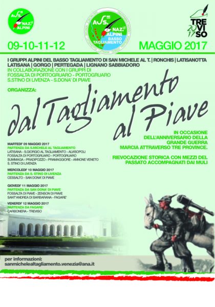 In occasione della 90ª Adunata nazionale i Gruppi alpini del Basso Tagliamento (S.Michele al Tagl.to, Ronchis, Latisanotta, Latisana, Gorgo, Pertegada e Lignano) organizzano la marcia “Dal Tagliamento al Piave” che, attraversando tre provincie, raggiungerà Treviso.