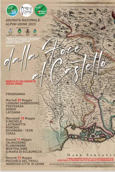 In occasione dell’Adunata nazionale i Gruppi alpini di Lignano Sabbiadoro, Pertegada, Gorgo, Latisana, Latisanotta, Ronchis e San Michele al Tagliamento hanno organizzato una marcia di solidarietà che li porterà, in quattro giorni, fino a Udine. Questa compagine denominata “Gruppi del Basso Tagliamento” (che comprende sia Gruppi della Sezione di Udine che di Venezia) non è nuova a questo tipo di iniziative, infatti nel 2014 sono andati fino a Pordenone e nel 2017 hanno raggiunto Treviso. Sempre accompagnati dai fidati muli.