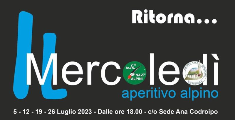 Tutti i mercoledì di luglio il Gruppo alpini di Codroipo organizza nella propria sede, dalle ore 18,00 in poi, il “Mercoledì aperitivo alpino” per sorseggiare un aperitivo scambiando due chiacchiere.
