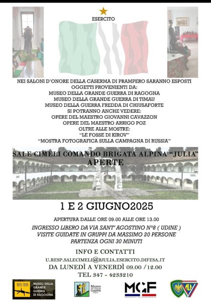 Domenica 1 e lunedì 2 giugno, in occasione della 79ª Festa della Repubblica, sarà possibile visitare le Sale Cimeli della Brigata Alpina “Julia” presenti alla caserma “Di Prampero” di via S. Agostino 8, sede del Comando Brigata.