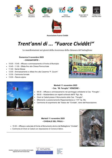 L’Associazione “Fuarce Cividât” organizza una serie di cerimonie ricordando la chiusura del battaglione.